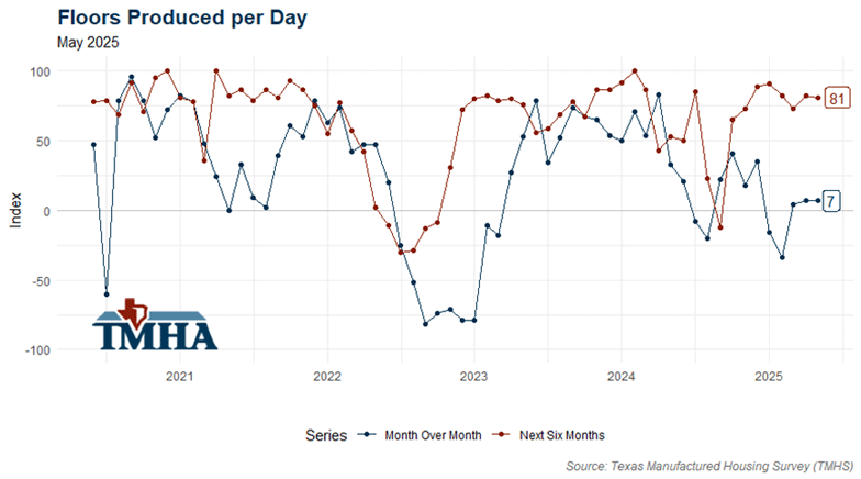The Texas Manufactured Housing Survey (TMHS) for May has run rates moving slightly higher and out-of-state shipments moving lower once again, so take the same calls as last month, over on shipments and a coin flip on production.